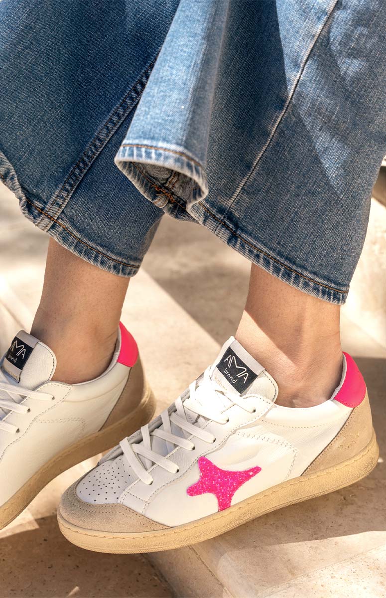 Avec son cuir blanc impeccable associé à des touches de rose et de daim beige, cette sneaker incarne la modernité et la féminité. Le design soigné se distingue par un logo rose étincelant “Ama Brand” qui apporte une signature lumineuse et reconnaissable à l’ensemble.