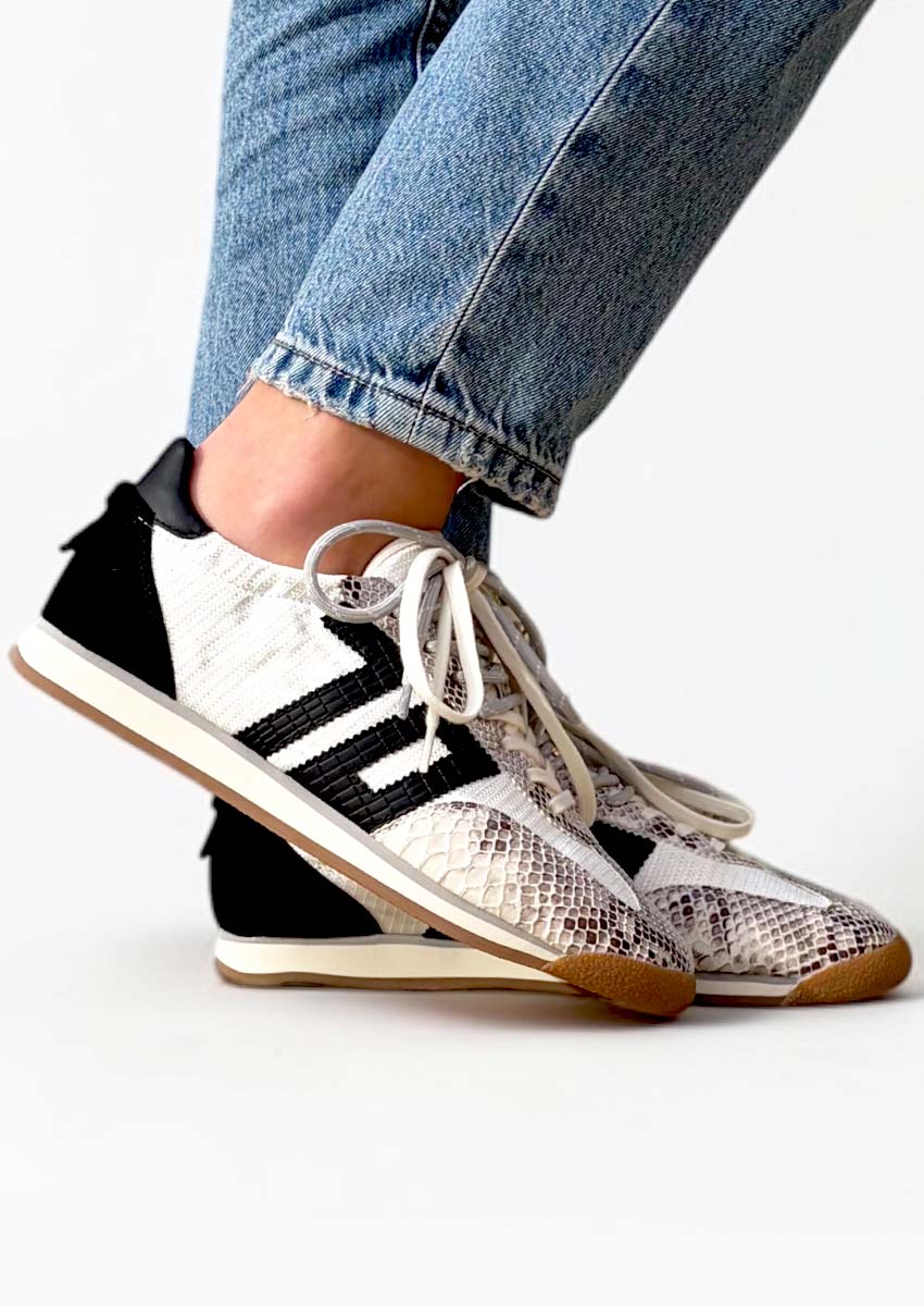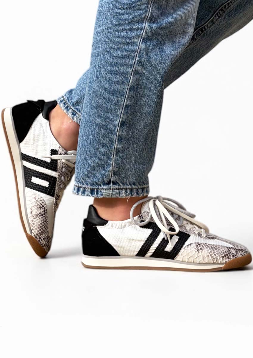 Pensée pour les femmes qui veulent sortir de la basket blanche classique, cette paire s’impose comme une basket femme blanche originale qui apporte du style au quotidien. Son jeu de couleurs en fait aussi un excellent choix pour les clientes à la recherche d’une basket femme noir et blanc, élégante et moderne. L’avant de la chaussure, habillé d’un subtil imprimé reptile, répond parfaitement à la recherche d’une sneaker femme effet python ou d’une basket femme avec imprimé python, deux tendances fortes dans l’univers de la sneaker féminine.