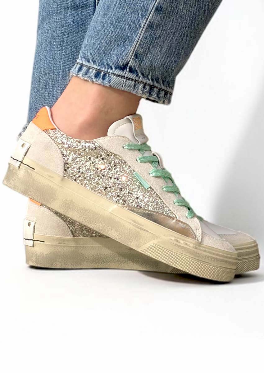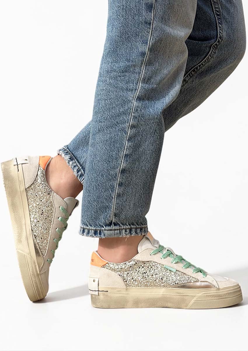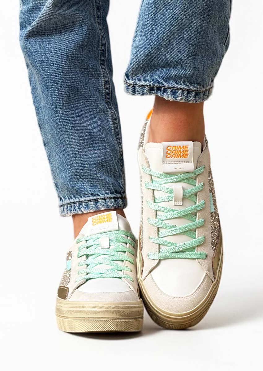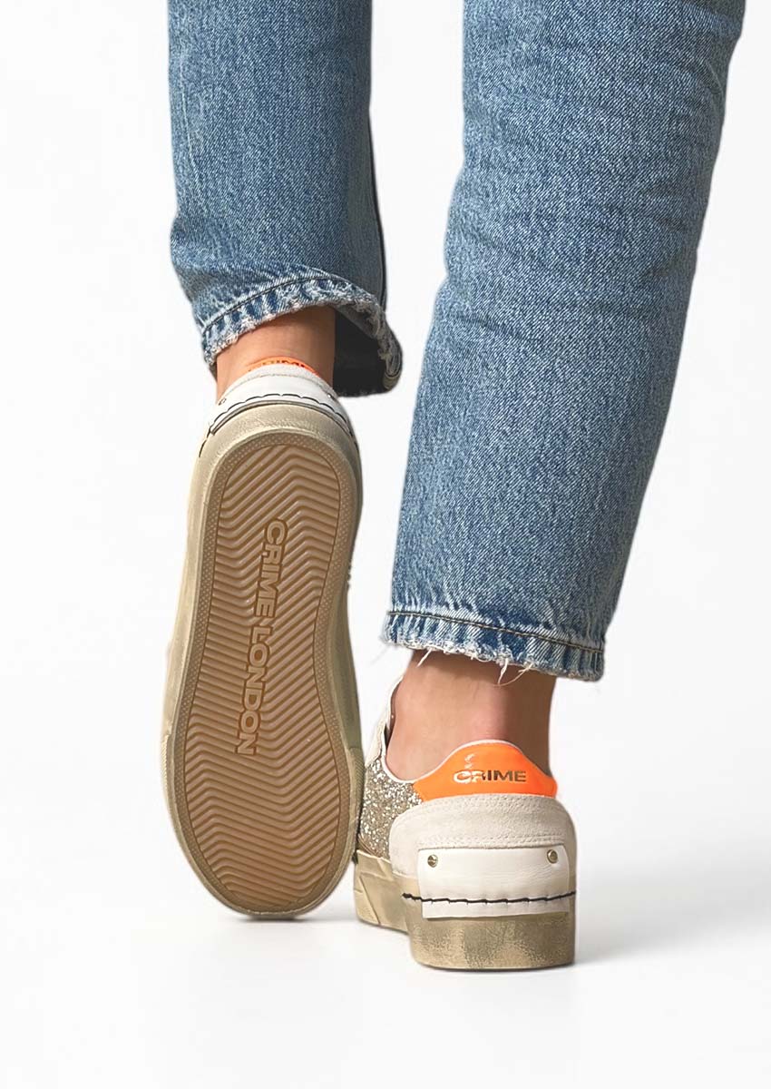 Les Crime London SOHO Gold Fever – Sneakers femme dorées pailletées, sont des baskets au style affirmé. Entre tige glitter platine, empiècements en cuir laminé, détails crème, touche orange vive et double lacets menthe lamé et blanc, ce modèle made in Italy apporte de l’éclat à vos tenues. Leur semelle plateforme à effet vintage complète une silhouette tendance, féminine et facile à porter au quotidien.