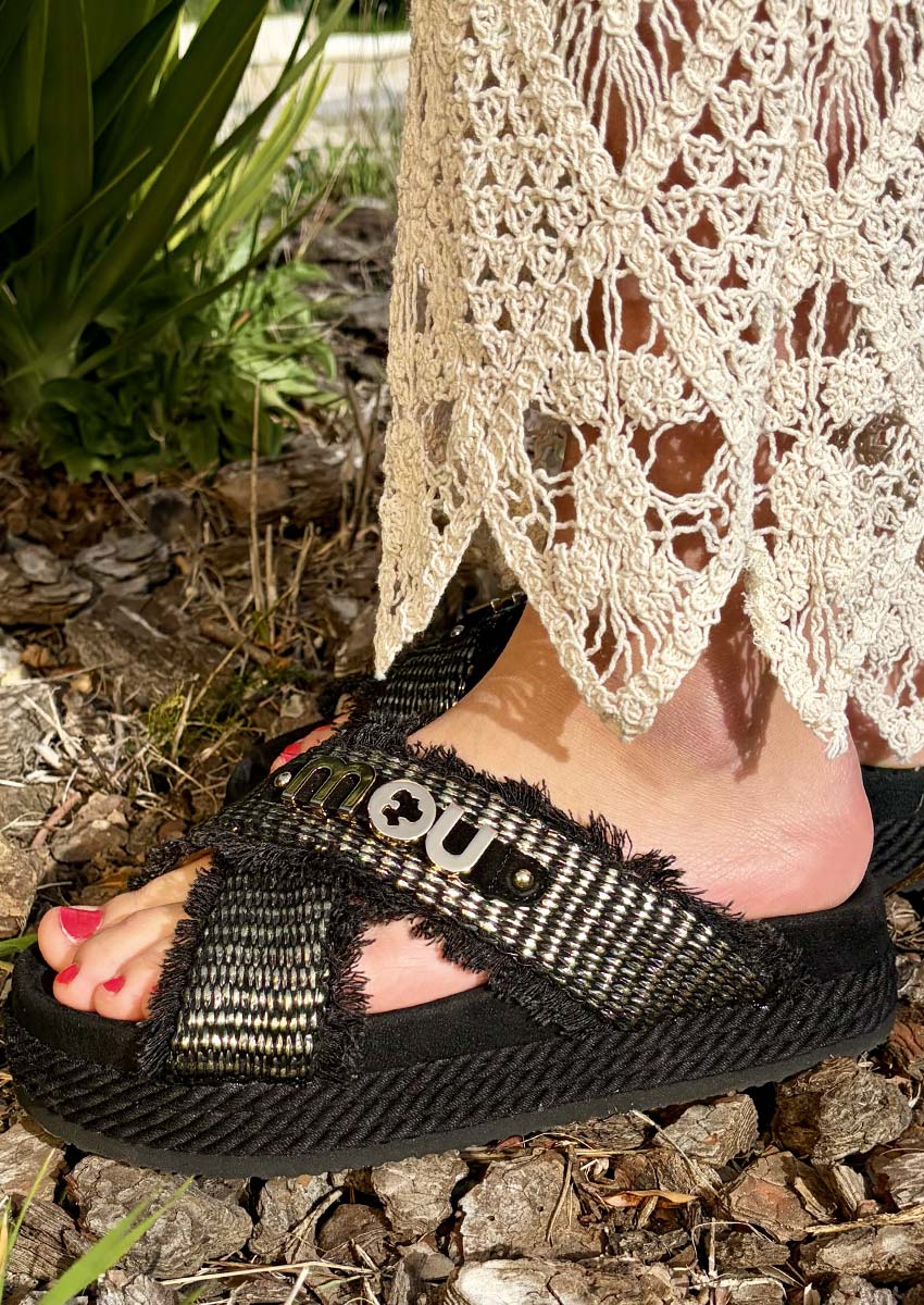 Sandales MOU Criss Cross Noir Métal Femme, plates et ultra-confortables, idéales pour marcher toute la journée. Brides croisées et semelle légère pour un maintien parfait. Style bohème chic, à porter avec robe, short ou pantalon d’été