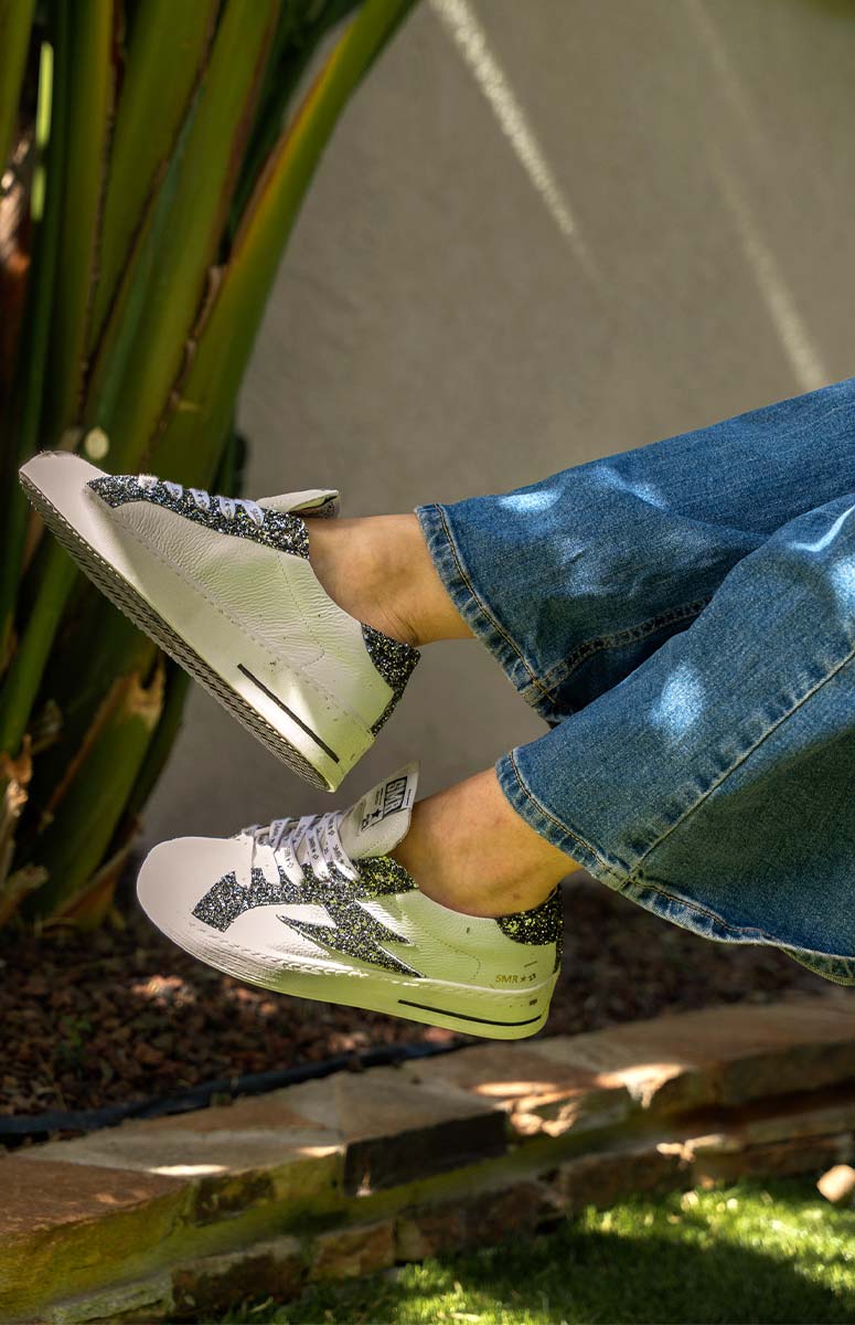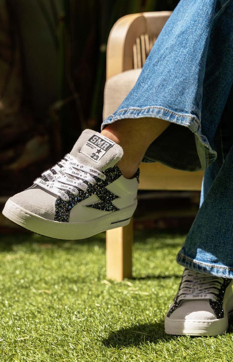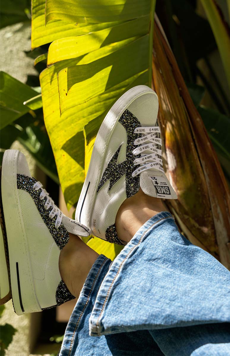 Un cuir lisse blanc mélangé à des paillettes noires, logo éclair emblématique en glitter et contrefort talon scintillant, parfait pour la tendance du moment.