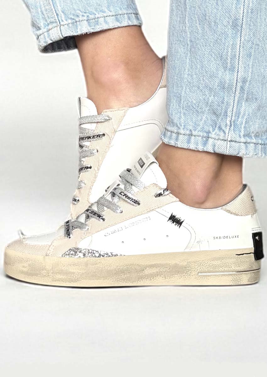 Description des Sneakers Crime London Femme en Cuir Blanc – SK8 Deluxe “Desert Stardust”